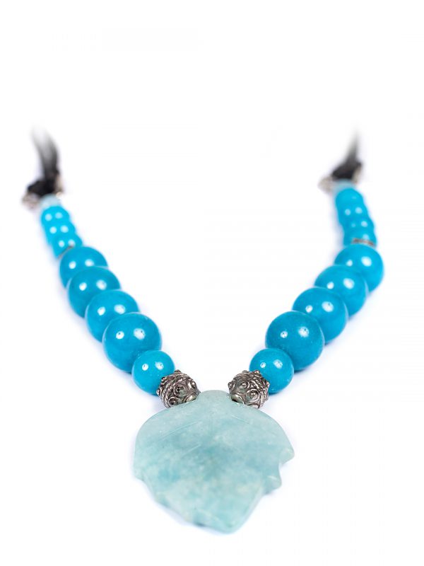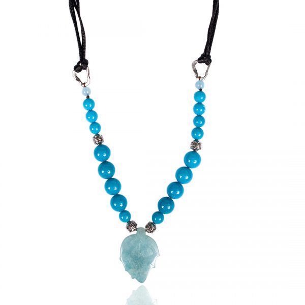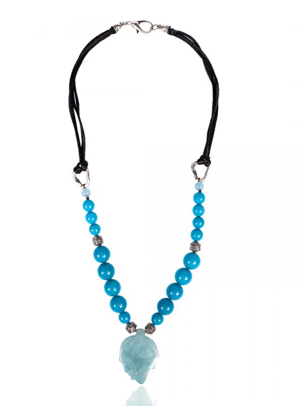 Μακρύ κολιέ με κυρίαρχο στοιχείο φύλλο από γαλάζιο ορυκτό αχάτη, σε συνδυασμό με τουρκουάζ μαγνησίτη.