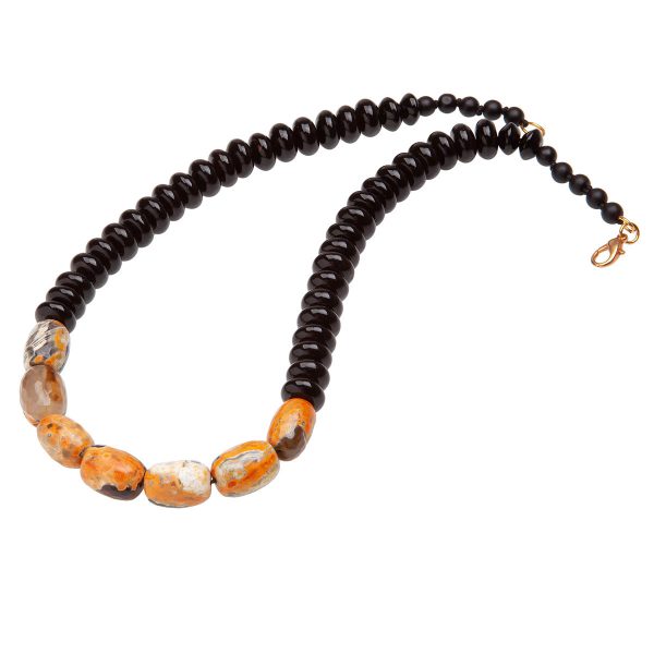 Κολιέ από μαύρο όνυχα και αχάτη σε τόνους ιβουάρ, πορτοκαλί και μαύρο.